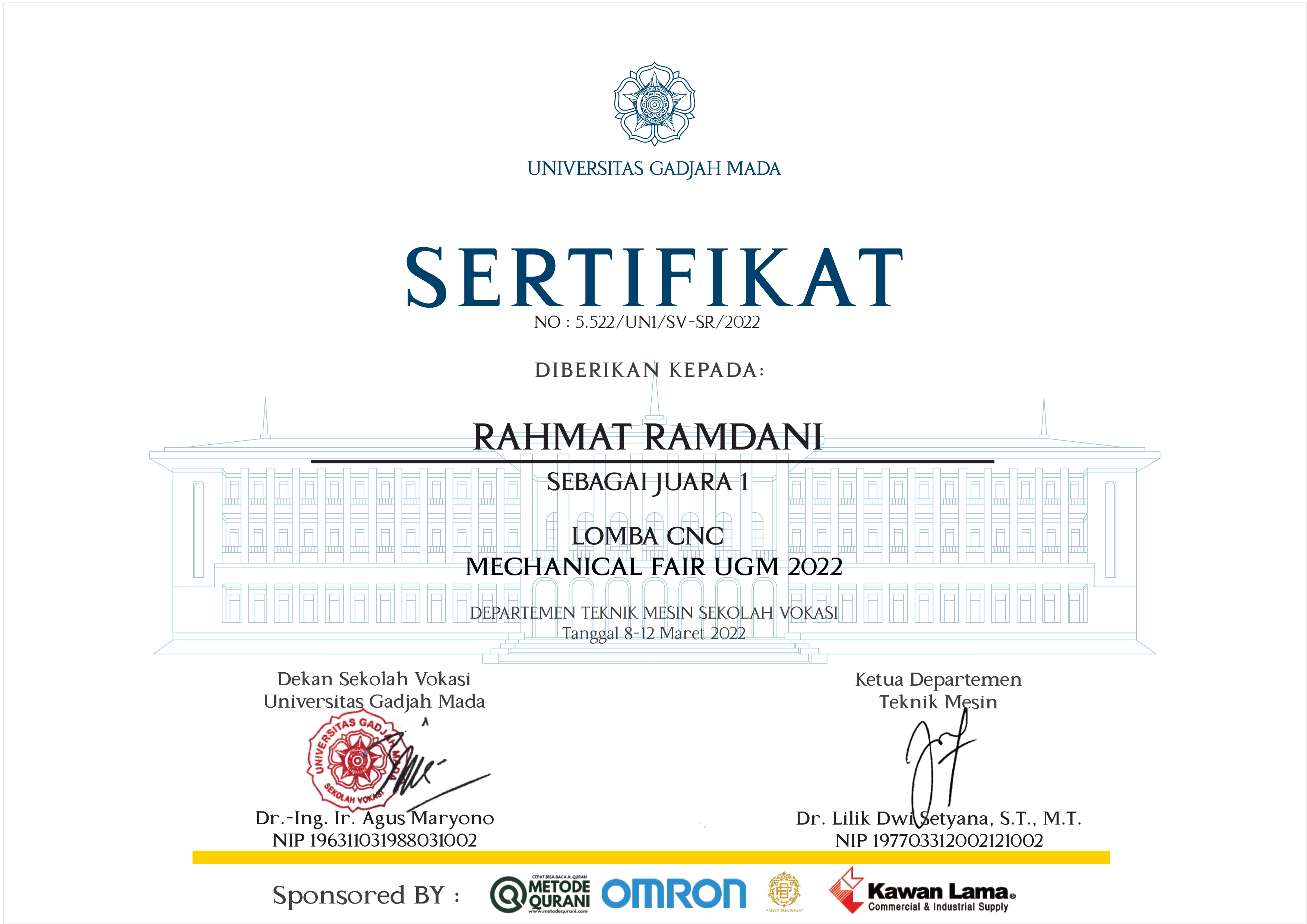 I joined many competition for many years since I was at school. One of my biggest achievement is to win the the gold medal CNC programming competition of Mechanical fair at Gadjah Mada University on national level. click here to see the certificate