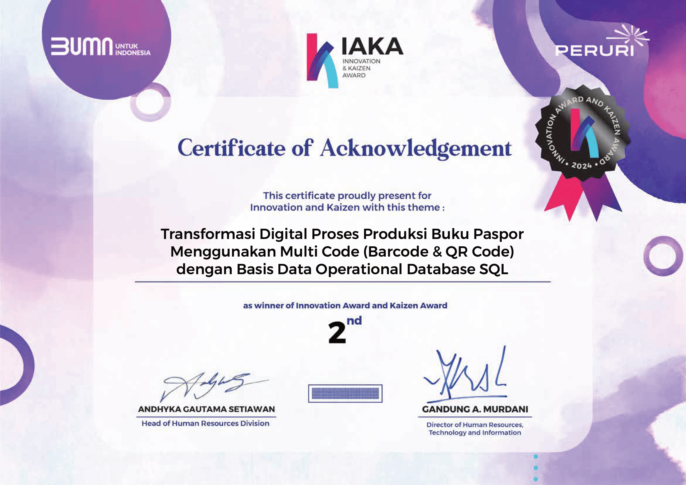 After I graduated from my vocational high school, I decided to work for one of biggest national enterprise named PERUM PERECETAKAN UANG REPUBLIK INDONESIA (PERURI). it has been 3 years and many achievements that i got here. one of them is to achieve semifinalist of Inovation Award dan Kaizen Award 2024-2025 with duoble digit grandpize. click here to see the certificate
